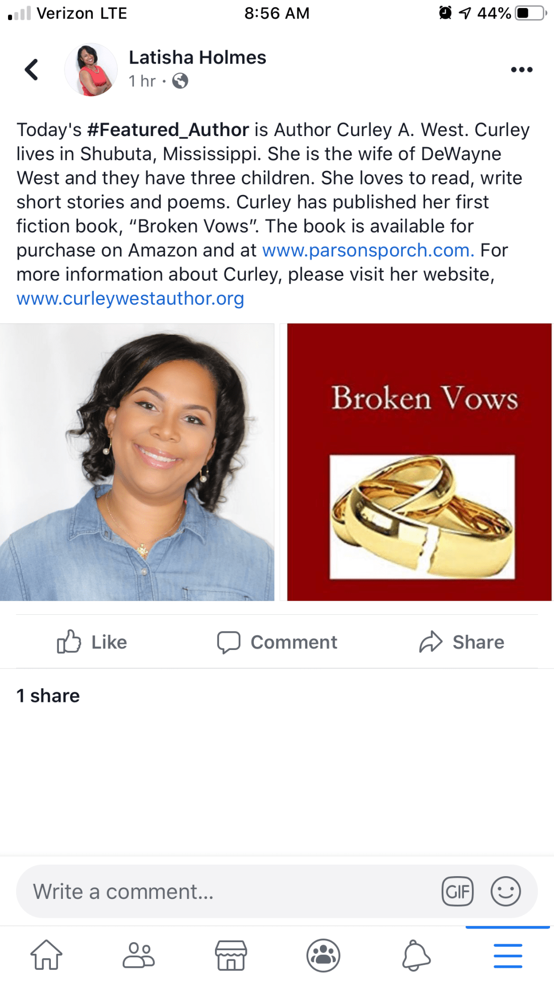 I am a mother, writer and business professional. I published my first fiction book, Broken Vows”. I live in Mississippi. I love reading, writing and spending time with my family. I love to talk to people and offer a word of encouragement. I am stepping out on faith and pursuing one of my dreams of being a published author. I have learned that as long as I have faith, move forward and cast fear out of my mind; I will succeed. Remember Philippians 4:13. I hope my blog touches the lives of all that read it. Feel free to follow me and share with your friends and family.
